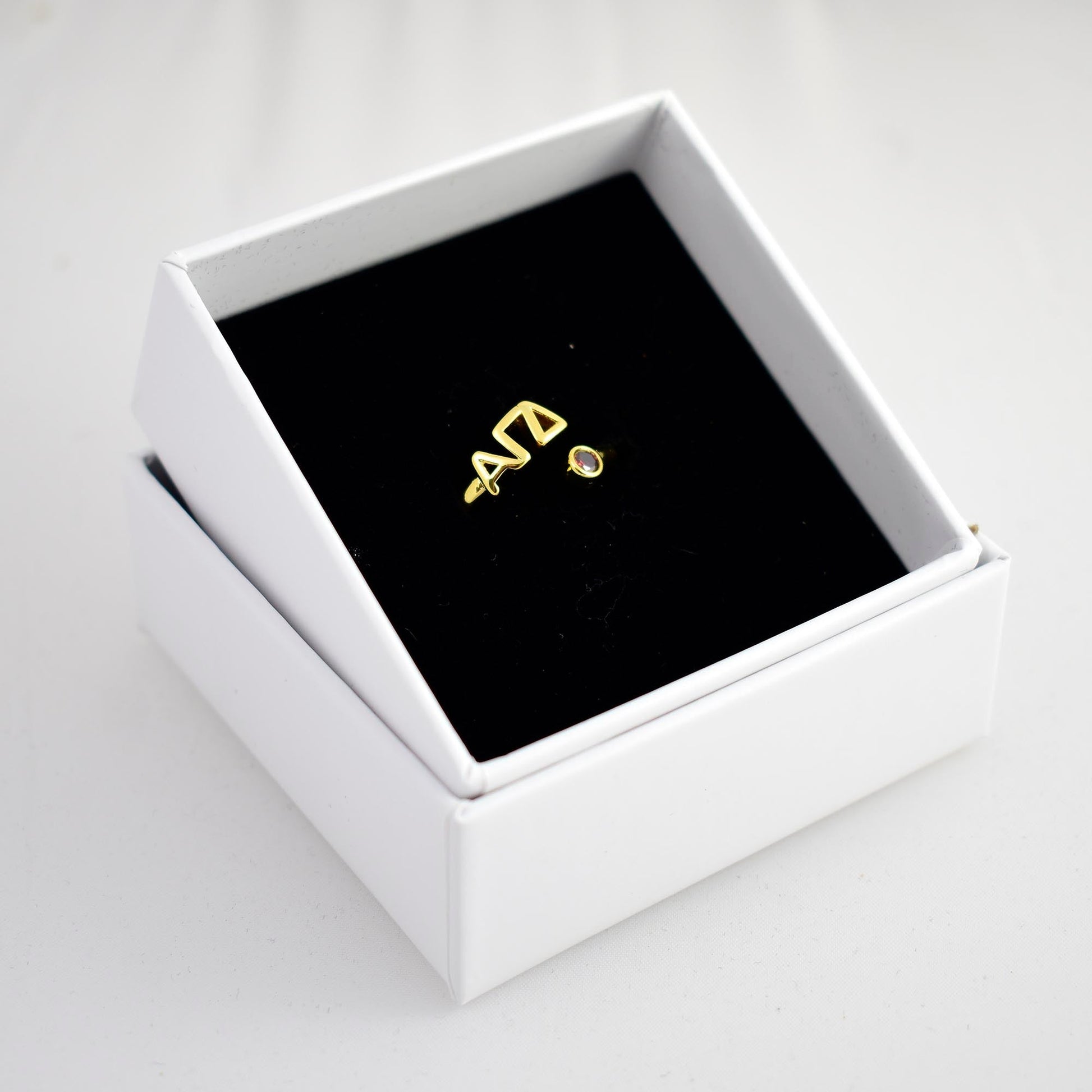 - SORORITY GREEK LETTER RING - Sorority pride is in the air! Show off your Alpha Gamma Delta sisterhood with this personalized wraparound ring. Proudly showing your Greek letters, plated in 18k gold and including a beautiful colored gemstone, they're perfect for continued wear at home or on campus.