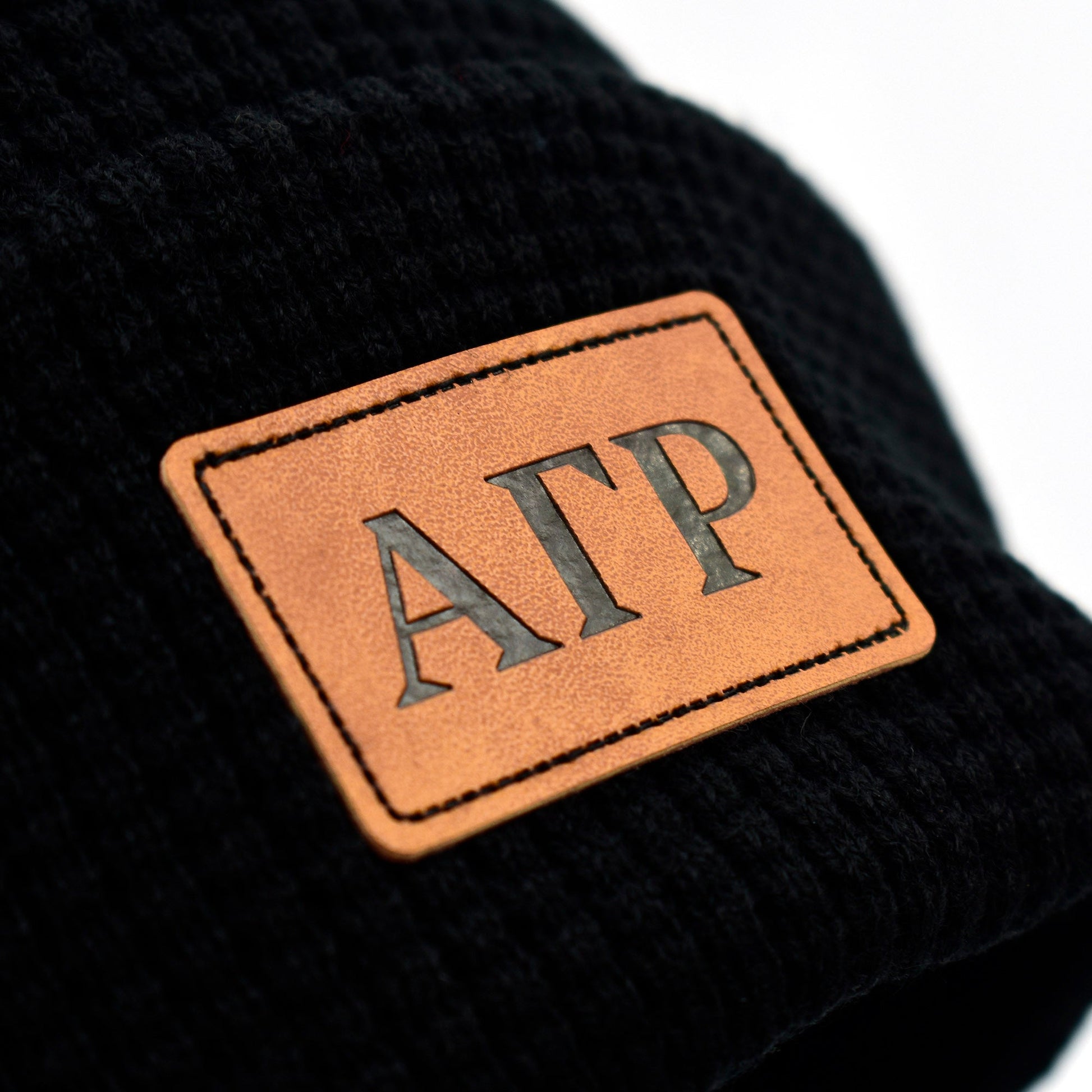 Show off your fraternity pride with this well-designed beanie hat, featuring your Greek letters printed on a faux-leather patch.