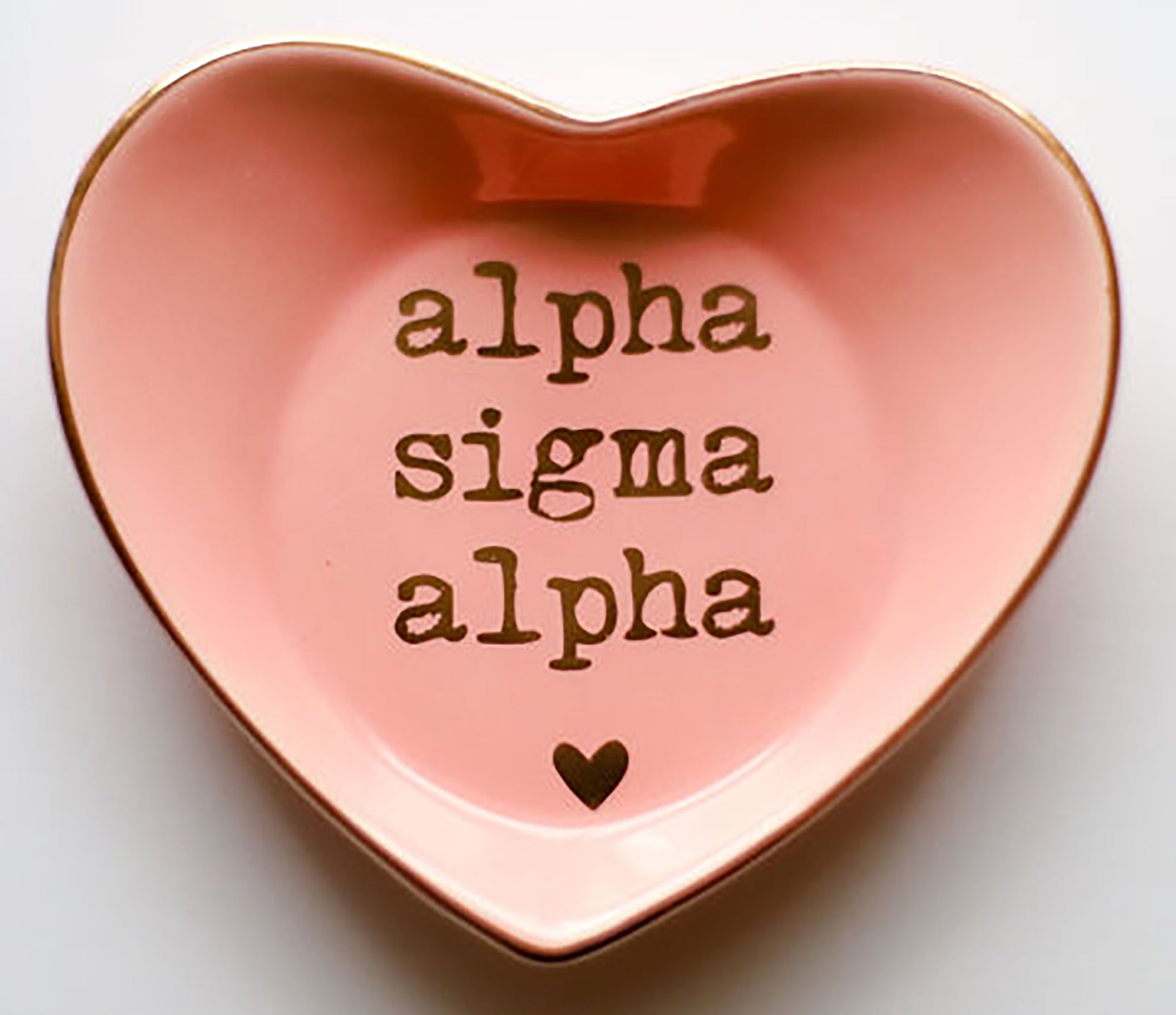 Our Alpha Sigma Alpha ceramic ring dish is the definition of chic with its high gloss finish and sorority name, heart and edge in gold. Great for rings, jewelry, keys or trinkets. Perfect for home or office!