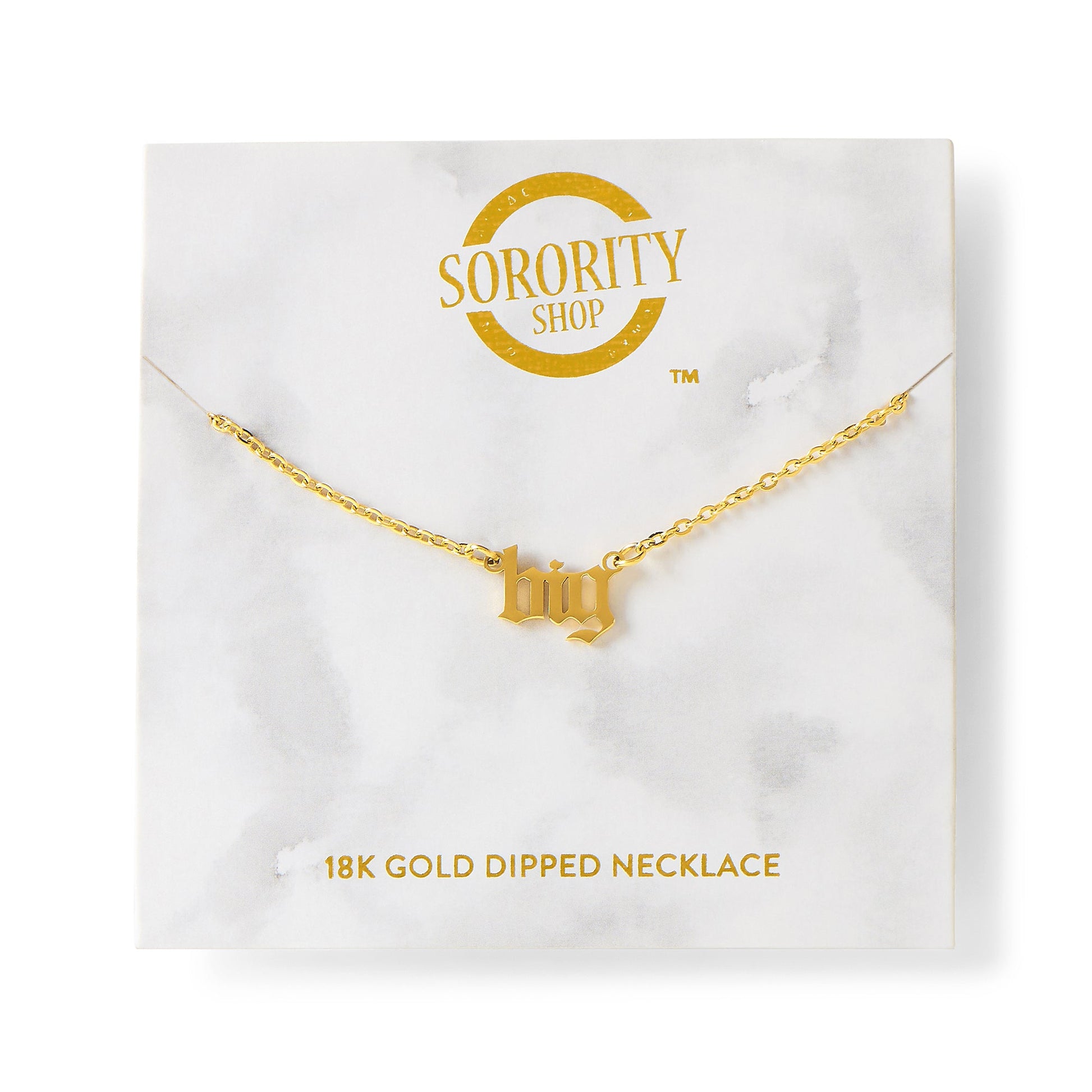 The perfect gift of Sisterhood! Our Sorority Sisterhood "Big" Old English Necklace features a pendent with "Big" written in an Old English font, dipped in 18k gold! This necklace comes with a perfectly giftable backer card with gold foil printing. Perfect for a big and little gift!