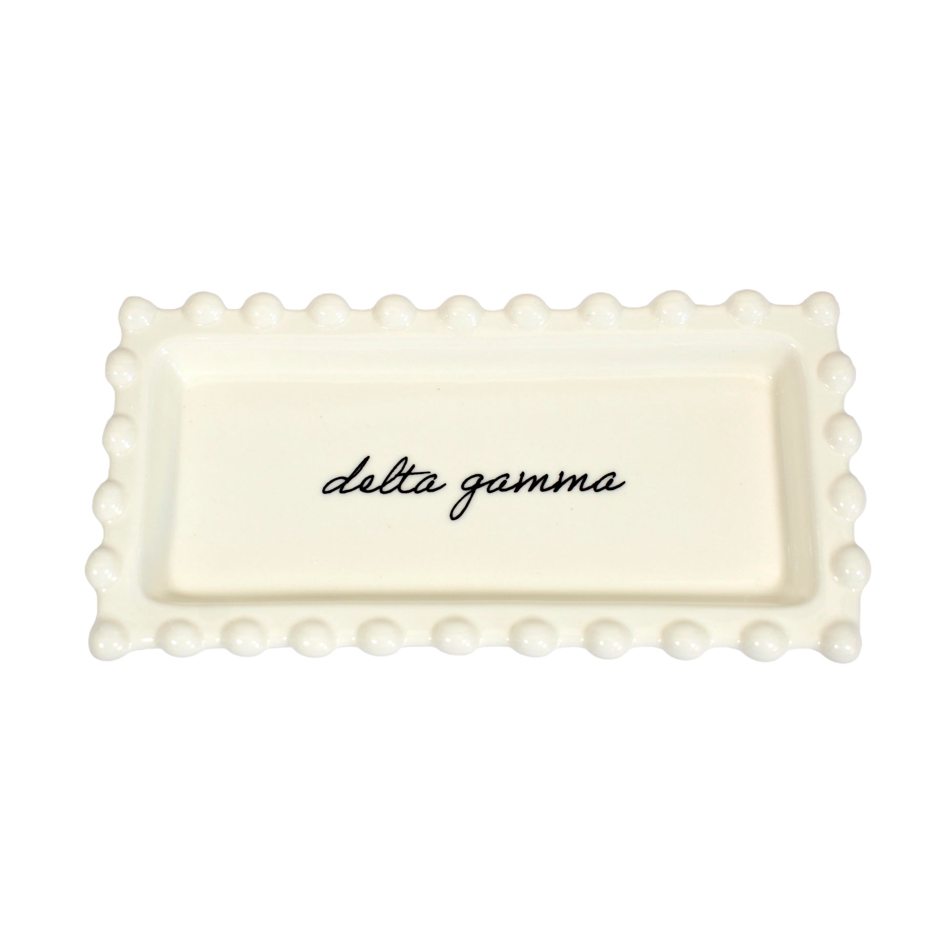 - SORORITY NAME IN CURSIVE SCRIPT: This Delta Gamma jewelry dish boasts an attractive monochromatic look, proudly displaying your sorority name in cursive script.