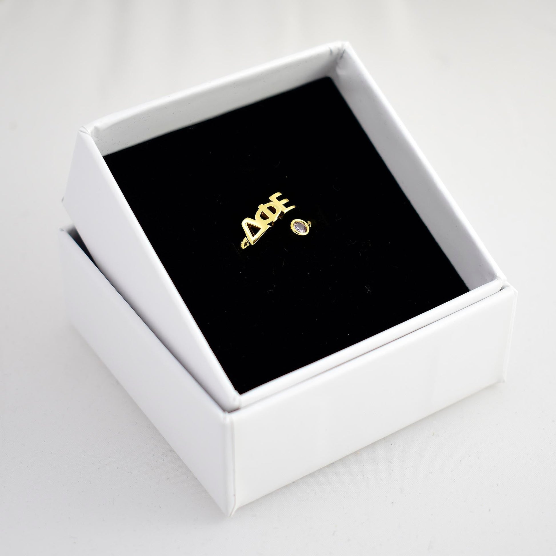 - SORORITY GREEK LETTER RING - Sorority pride is in the air! Show off your Delta Phi Epsilon sisterhood with this personalized wraparound ring. Proudly showing your Greek letters, plated in 18k gold and including a beautiful colored gemstone, they're perfect for continued wear at home or on campus.