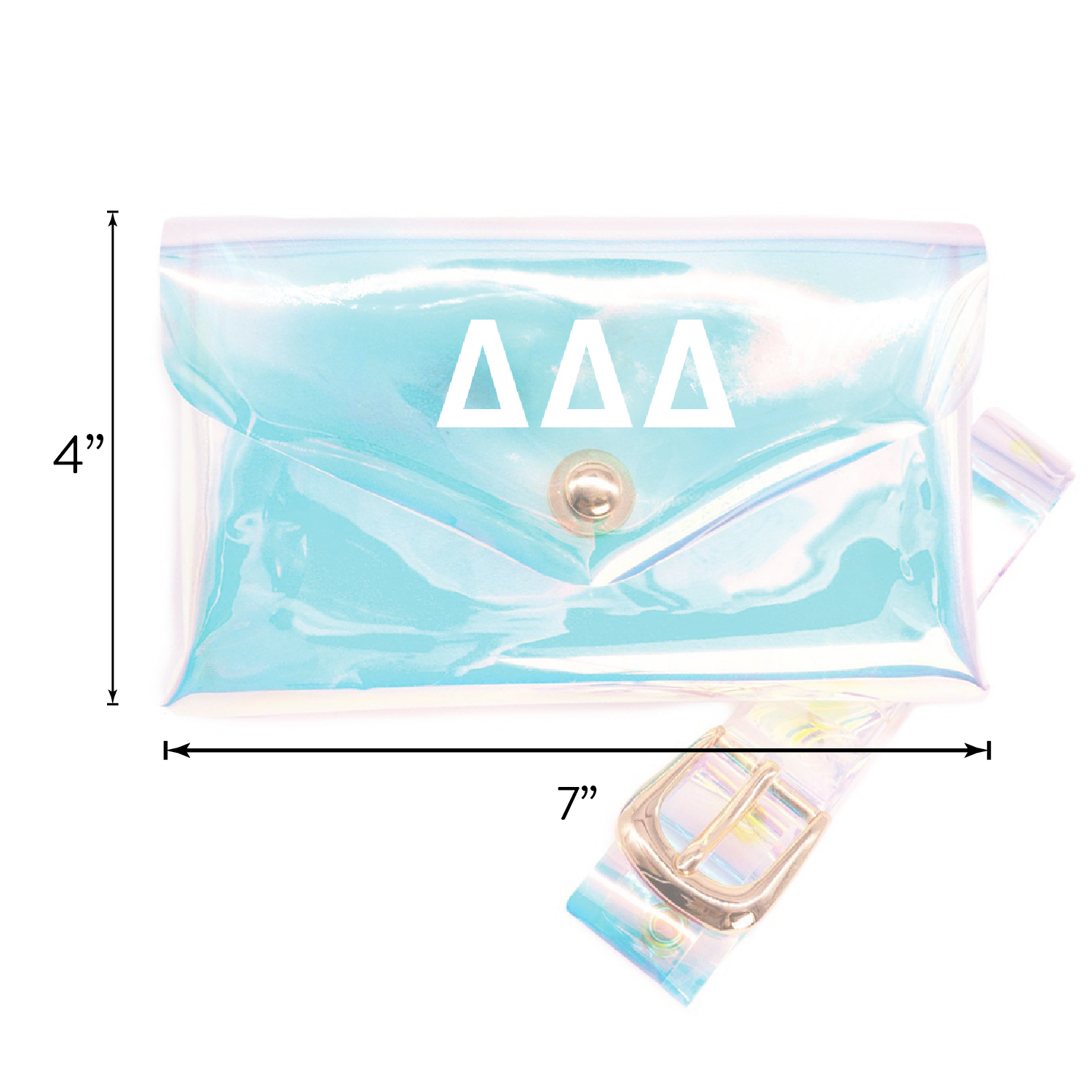 Our Holographic Belted fanny pack is sturdy, lightweight and comfortable to wear. The holographic material constantly changes color from every angle but is clear enough to be "stadium approved". The two compartment design has individual rainbow zippers and is roomy enough to hold ALL of your essentials. The strap with silver buckle is adjustable to give you just the fit you want! Measures 12.75 x 5 x 6.5 inches.