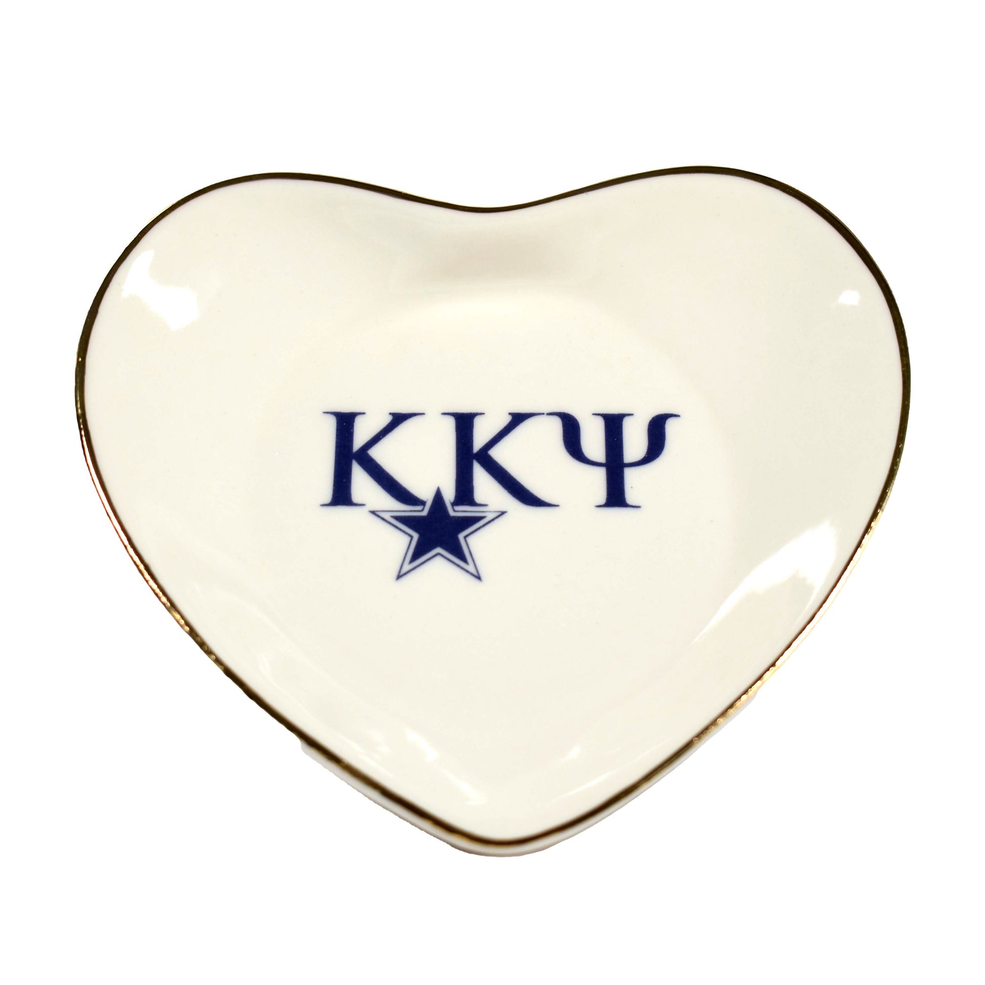 Our Kappa Kappa Psi ceramic ring dish is the definition of chic with its high gloss finish and fraternity name, heart and edge in gold. Great for rings, jewelry, keys or trinkets. Perfect for home or office!