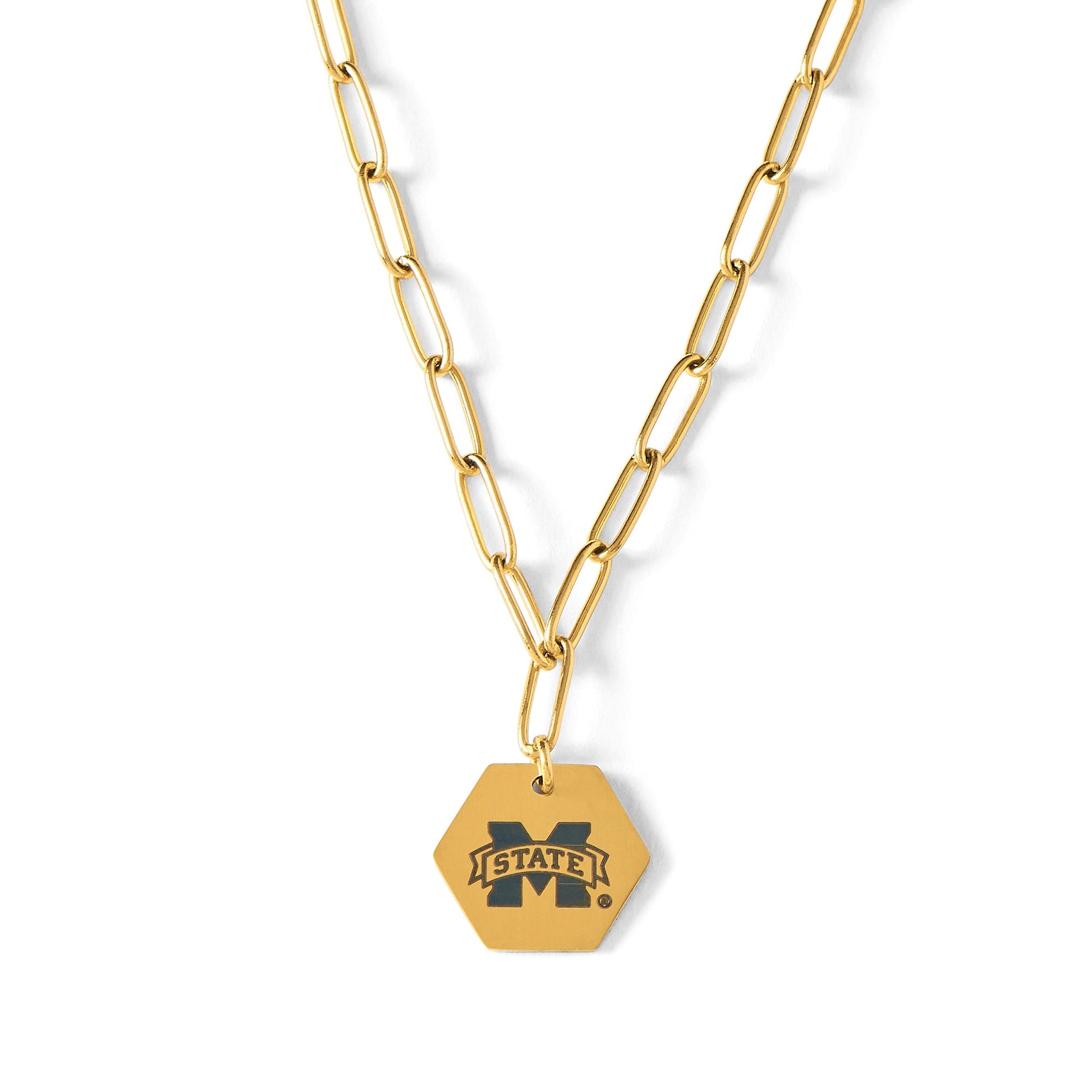 Our Mississippi State University Necklace features your Mississippi State University logo on a 15mm hexagon shaped pendant, with a paperclip style chain, all dipped in 18K Champagne gold!