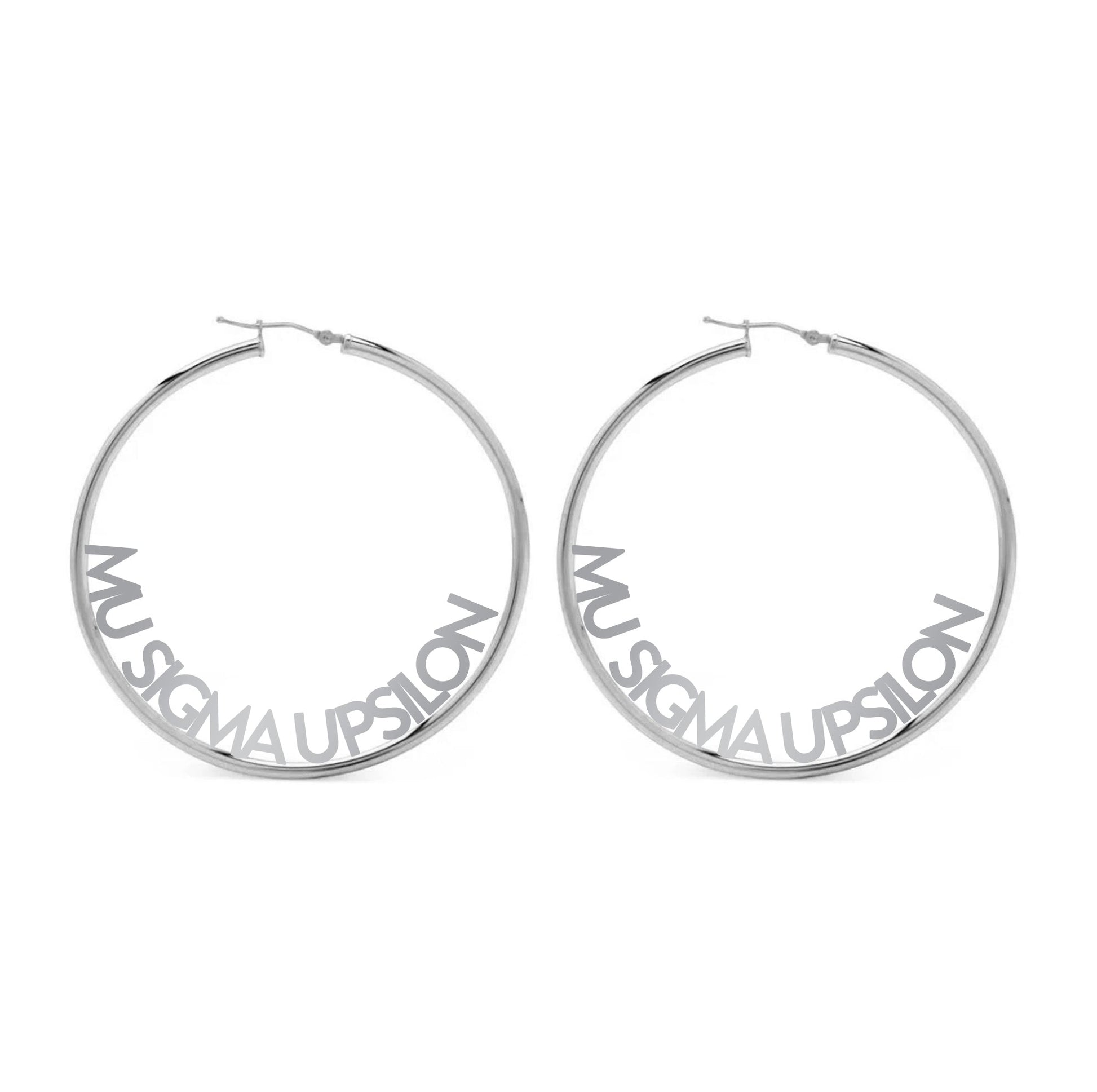 Mu Sigma Upsilon Silver Hoop Earrings- Name Design