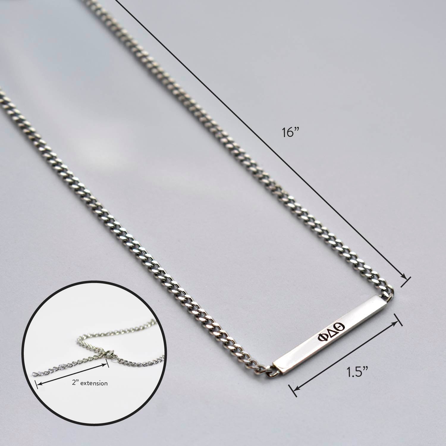 STAINLESS STEEL QUALITY CONSTRUCTION – The stainless steel chain necklace is 18" (with a 2" extension) and securely attaches to the 1 ½” x 3/16” steel bar pendant featuring the engraved fraternity letters. Results in an eye-catching look!