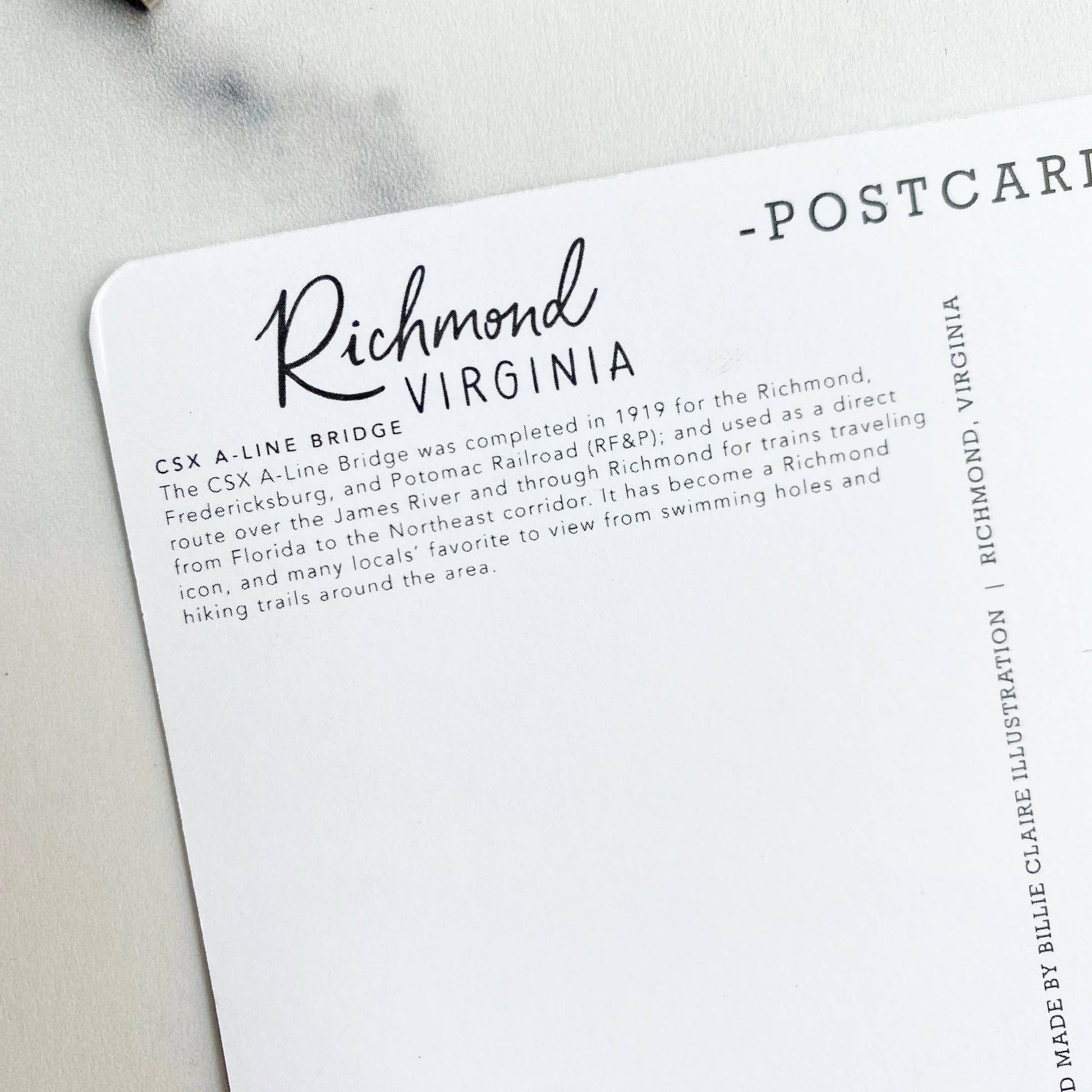 Text on the front reads: Richmond, Virginia - CSX A-Line Bridge. The back is a standard postcard format, with fine print that reads: Richmond, Virginia - CSX A-Line Bridge: The CSX A-Line Bridge was completed in 1919 for the Richmond, Fredericksburg, and Potomac Railroad (RF&P); and used as a direct route over the James River and through Richmond for trains traveling from Florida to the Northeast corridor. It has become a Richmond icon, and many locals' favorite to view from swimming holes and hiking trails around the area.
