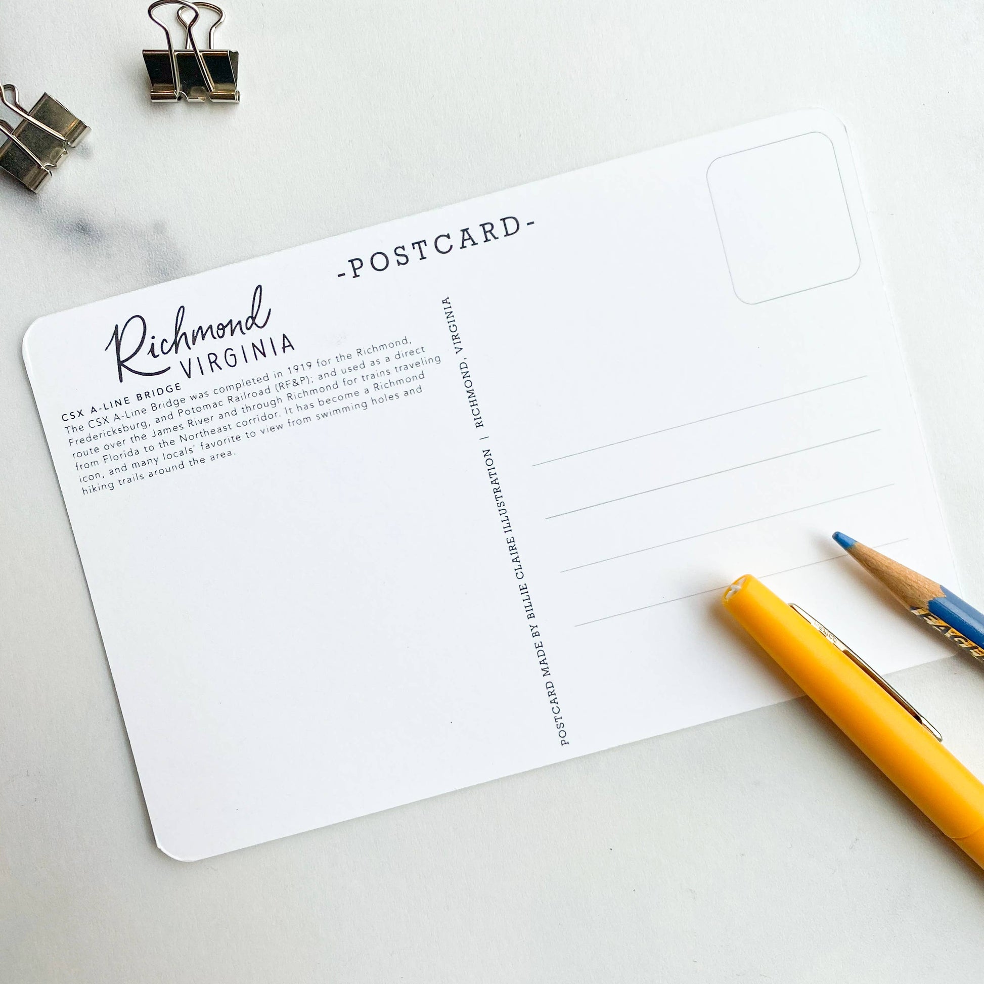This 4x6 postcard is printed on a thick 18pt uncoated coverstock, perfect for any pen and durable enough to withstand the post. Description: A 4x6 white postcard with a photo image of the James River running under the CSX A-Line Bridge, with a white hand drawn blue heron.