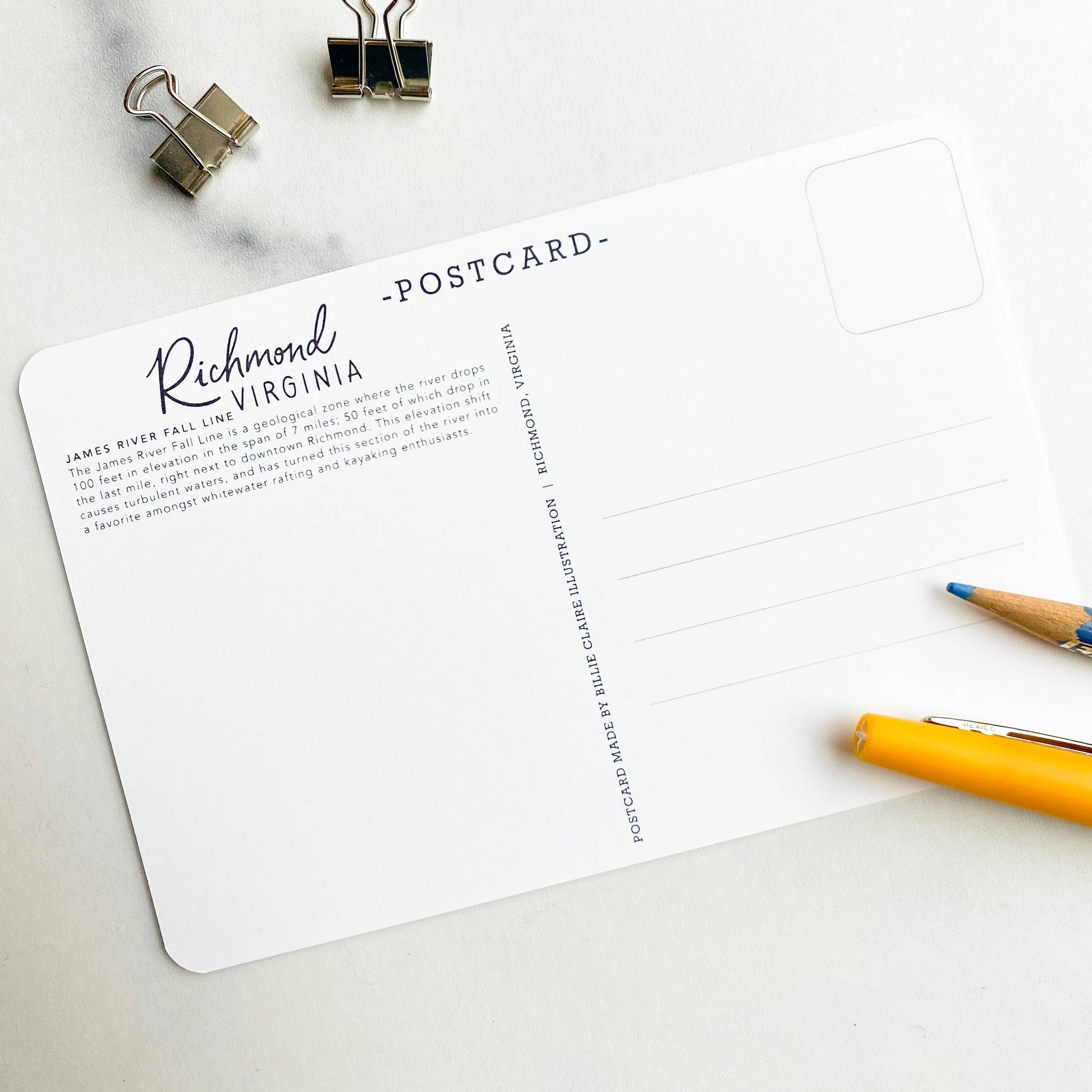 The back is a standard postcard format, with fine print that reads: Richmond, Virginia - The James River Fall Line: The James River Fall Line is a geological zone where the river drops 100 feet in elevation in the span of 7 miles; 50 feet of which drop in the last mile, right next to downtown Richmond. This elevation shift causes turbulent waters, and has turned this section of the river into a favorite amongst white water rafting and kayaking enthusiasts.