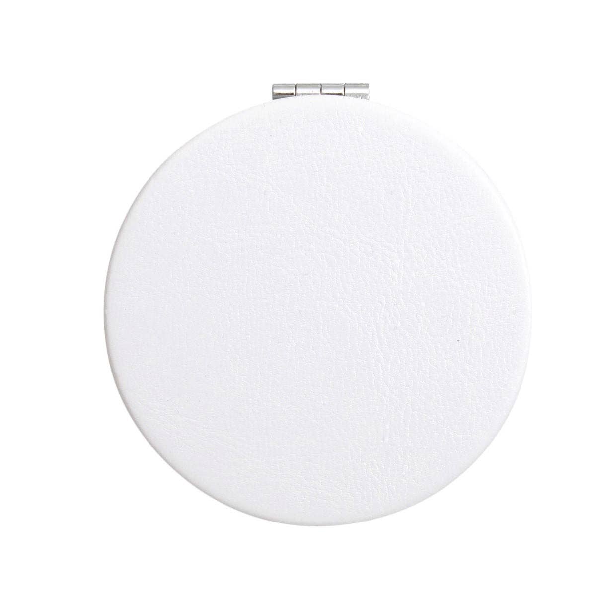 Sigma Gamma Rho Sorority Paraphernalia SGRHO Blue and Gold Rhinestone, White Faux Leather Coating, and Silver Metal Compact Mirror. Hinge Opening. Cosmetic Mirror Interior with Regular Plane Mirror and Magnified Mirror. Anti-Fog Glass.