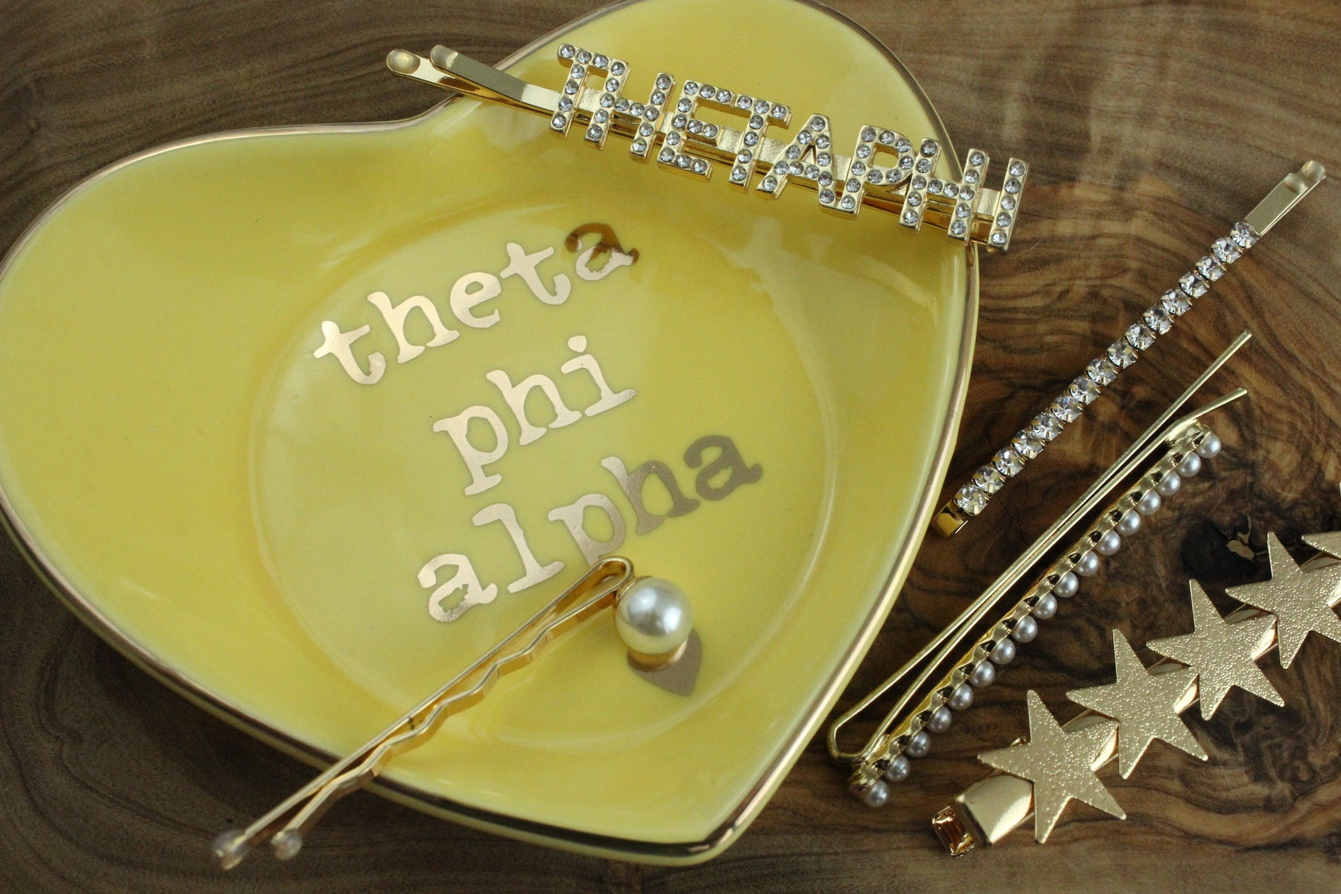 Our Theta Phi Alpha ceramic ring dish is the definition of chic with its high gloss finish and sorority name, heart and edge in gold. Great for rings, jewelry, keys or trinkets. Perfect for home or office!
