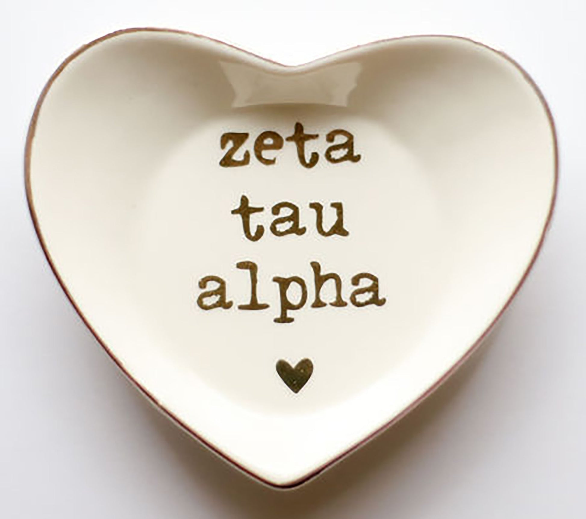 Our Zeta Tau Alpha ceramic ring dish is the definition of chic with its high gloss finish and sorority name, heart and edge in gold. Great for rings, jewelry, keys or trinkets. Perfect for home or office!